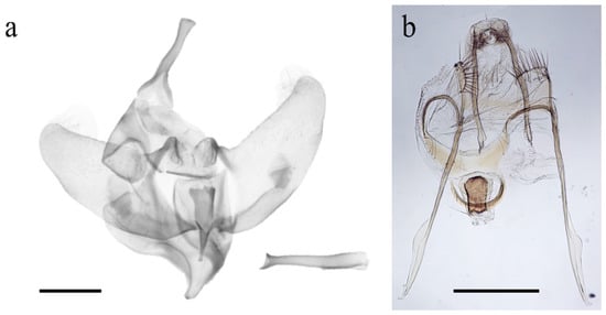 Genitalia of Givira ethela. (a) Complete male genitalia and aedeagus; (b) Female genitalia. Scale bar = 1.0 mm.