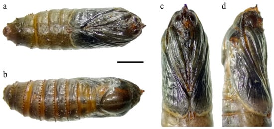 Pupa of Givira ethela. (a,c) Frontal view, at different magnifications; (b) Back side; (d) Right side. Scale bar: (a,b) = 2.0 mm; (c,d) = 1.5 mm.