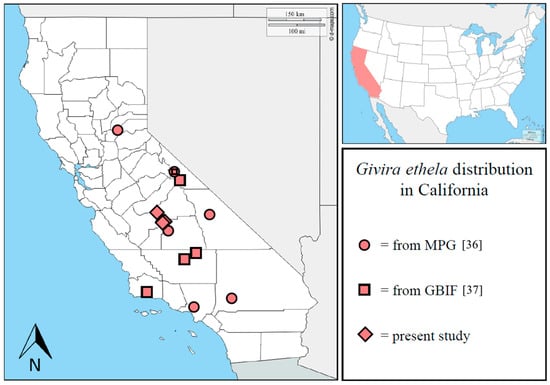 Updated distribution of Givira ethela in California. Adapted from www.d-maps.com. Data from MPG [36] and GBIF [37] are included.