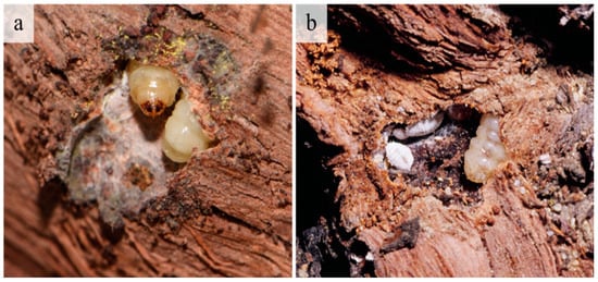 Galleries and Givira ethela larvae in grapevine trunks. (a) A mature larva, with silk inside the gallery; (b) Larva with different stages of the mealybug Planococcus ficus.