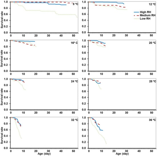 Three different patterns of the effect of RH could be determined: (1) at 8 and 36 °C, differences between the three RH regimes occurred, and the highest survival was recorded at the medium RH regime. (2) From 12 to 20 °C, the highest survival was recorded at high RH, and there were no significant differences between the medium and low RH regimes. (3) The last pattern occurred at intermediate-high temperatures (24 to 32 °C), when the lowest survival was associated with low RH, and there were no differences between medium and high RH regimes (Figure 1 and Table 1).