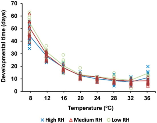 The egg developmental time was affected by the temperature and RH, but no interaction between these two factors occurred. As expected, the higher the temperature, the shorter the hatching time in the range of 8–32 °C. These results agree with previous studies [18,30,31]. On the other hand, the hatching time was longer at low rather than at medium and high RH regimes as was previously stated for other insects [15,38]. An increase in the egg developmental time was observed when the RH was lower than 70% [30]. In some cases, at low RH environments, the extension of the development appeared to be a result of the depression of the egg metabolism due to water loss [39].