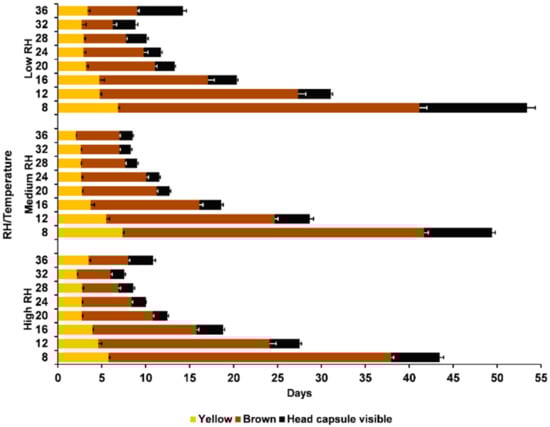 There were significant differences in the duration of the egg colour stages (χ2 = 2720.38; p < 0.0001) (Figure 3). These differences were also significantly affected by the temperature (χ2 = 2972.49; p < 0.0001) and RH (χ2 = 27.14; p < 0.0001). However, the duration of the egg colour stages was also significantly affected by the interaction with the RH (χ2 = 37.30; p < 0.0001). The eggs spent more time in the brown stage than in the other two stages (Figure 3). At low RH, the yellow stage was significantly shorter than the head capsule visible stage, whereas at medium and high temperatures, it was the contrary.