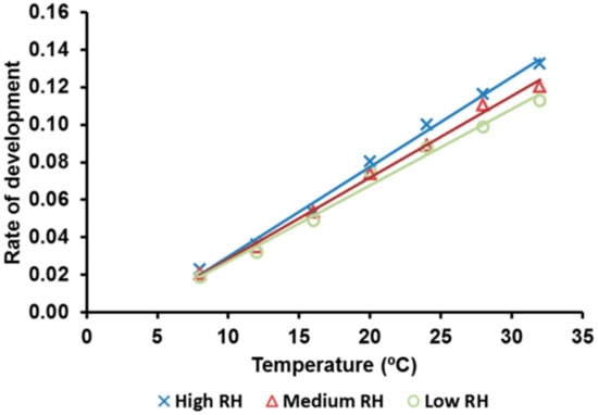 When the rates of the development of eggs were fitted against the temperatures tested, the relationship was adequately described by the linear model for any of the three RH regimes (Figure 4, Table 2). The minimum developmental threshold (T0) varied according to the HR regime. However, an inverse relationship was found for the thermal requirement (K) for completing the egg development (Table 2).