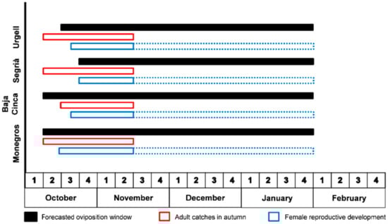 The theoretical range of the oviposition period, shown in Supplementary Table S1, could be adjusted to the actual oviposition window with (1) the field records of the larvae and eggs (Supplementary Table S2) and (2) the occurrence of adults in the autumn and the status of their reproductive systems (Supplementary Table S3). In fact, the theoretical prediction showed that the beginning of the oviposition window varied according to the area of the Ebro Valley and ranged from the second to the fourth week of October. However, the first reproductive adults were mainly caught after the second week of October in all four areas of the region (Supplementary Table S3). Therefore, the oviposition windows varied very little between areas (Figure 5).