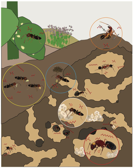 - Favreau, E.; Martinez-Ruiz, C.; Santiago, L.R.; Hammond, R.L.; Wurm, Y. Genes and genomic processes underpinning the social lives of ants. Curr. Opin. Insect Sci. 2018, 25, 83–90. [Google Scholar] [CrossRef]