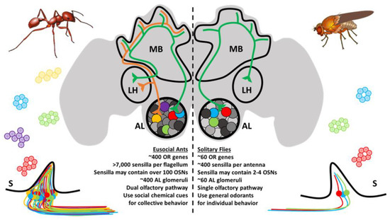 Ants and other eusocial Hymenopteran have a remarkably complex olfactory system relative to fruit flies and other solitary insects. Ant sensilla (S) may contain OSNs that are up to two orders of magnitude more numerous than those of the fruit fly. The antennal lobe (AL) glomeruli are also more numerous and follow a different developmental trajectory. Odor processing in higher-order brain structures, including the mushroom bodies (MB) and lateral horn (LH), occurs through a novel dual-olfactory processing pathway.