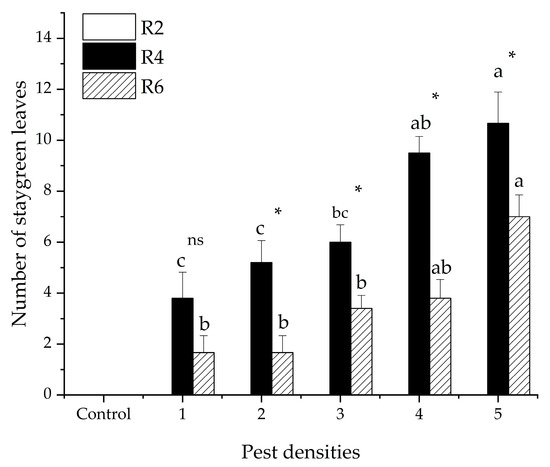 The number (mean ± SE) of staygreen leaves of soybeans caused by five pest densities during three soybean development stages (R2, R4 and R6). Pest densities are the row numbers of bean bugs. Note: The small letters denote significant differences among densities of pests in the same stage of soybean development, p < 0.05 (generalized linear mode (GLM)). * Means significant differences among different soybean development stages at the same density of pests at p < 0.05 (GLM). ns means no significant differences among different soybean development stages at same density of pests, p < 0.05 (GLM).