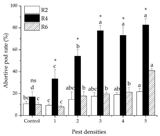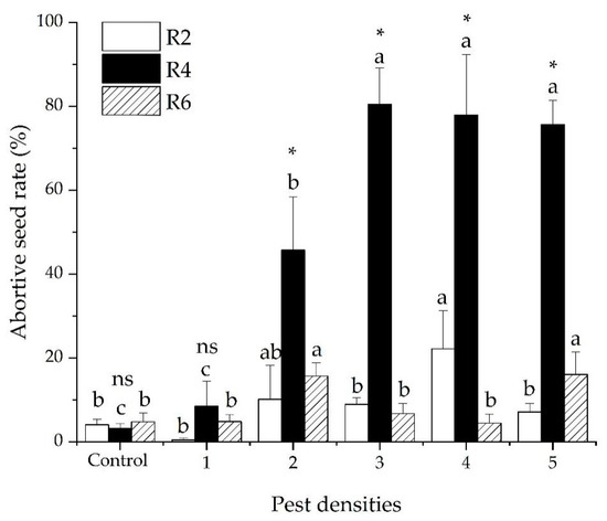 Soybean seed abortive rate (mean ± SE) following damage by five densities of R. pedestris during three soybean development stages (R2, R4 and R6). Pest densities are the row numbers of bean bugs. Note: The small letters indicate significant differences among densities of pests in the same stage of soybean development, p < 0.05 (GLM). * Means significant differences among different plant development stages at the same density of pests, p < 0.05 (GLM). ns means no significant differences among different plant development stages at the same density of pests, p < 0.05 (GLM)