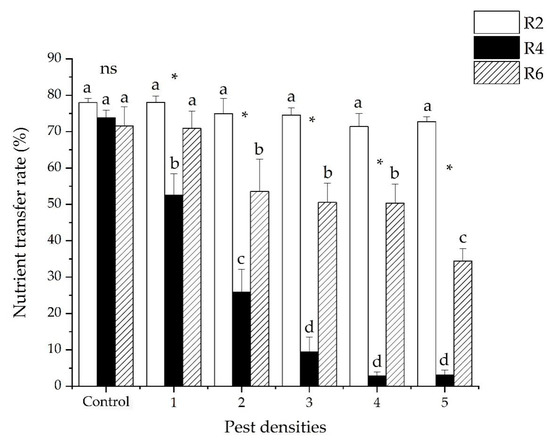 The nutrient transfer rate (mean ± SE) of soybeans when injured by five densities of R. pedestris during three soybean development stages (R2, R4 and R6). Pest densities are the row numbers of bean bugs. Note: The small letters indicate significant differences among densities of pests in the same stage of soybean development, p < 0.05 (GLM). * Means significant differences among different plant development stages at same density of pests at p < 0.05 (GLM). ns means no significant differences among different plant development stages at same density of pests at p < 0.05 (GLM).