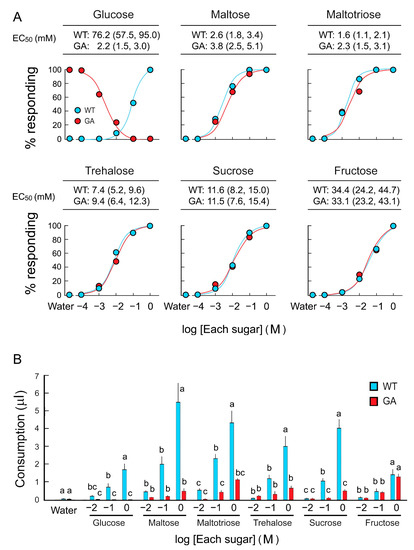 Feeding acceptance and rejection by five-day-old WT and GA females was assayed using six sugars over a concentration series (Figure 1A). WT females accepted sugars with high sensitivity in the following order, from high to low sensitivity: Maltotriose, maltose, sucrose, trehalose, fructose, and glucose. EC50 values for each sugar, except glucose, were similar between WT and GA females (Table S1). In consumption assays, both strains consumed equal amounts of water, and both consumed the other five sugar solutions in a dose-dependent manner. However, GA females consumed significantly less trehalose, sucrose, maltose, and maltotriose than WT females did (Figure 1B). Fructose consumption was similar in both strains. These results indicate that GA females initiated drinking di- and trisaccharides, but then terminated ingesting these sugars—but not fructose—earlier than WT females.