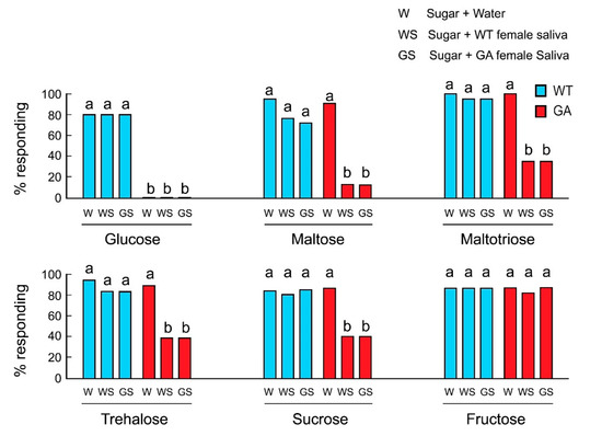 To evaluate the effects of saliva mixed with sugar solutions on the feeding response in the acceptance-rejection assay, saliva from 5 day-old WT and GA females was collected. Individual females were briefly anesthetized with carbon dioxide under a microscope and gently squeezed at the side of the thorax to avoid contamination with regurgitates from the gut. Saliva droplets were collected at the mouthparts into a microcapillary (10 µL, Kimble Glass). Collected fresh saliva was immediately used in experiments. Test solutions were prepared by mixing 3 μL of 200 mM maltose, maltotriose, trehalose, sucrose or 600 mM glucose or fructose with 3 μL of either HPLC-grade water or saliva of WT or GA females. The four tri- and disaccharides were presented to females at a final concentration of 100 mM, and the two monosaccharides (glucose and fructose) were presented at 300 mM in a total volume of 6 μL. These concentrations were chosen based on the EC70 in the acceptance-rejection assay. Saliva and sugars were incubated for 5 min at 25 °C. We tested 18–22 females in each strain. To evaluate the effect of saliva alone on the feeding response, either non-starved females or females that were starved for one day without food and water were tested with water only and the mixture of saliva and water at a 1:1 ratio (n = 20). All test solutions contained blue food dye.