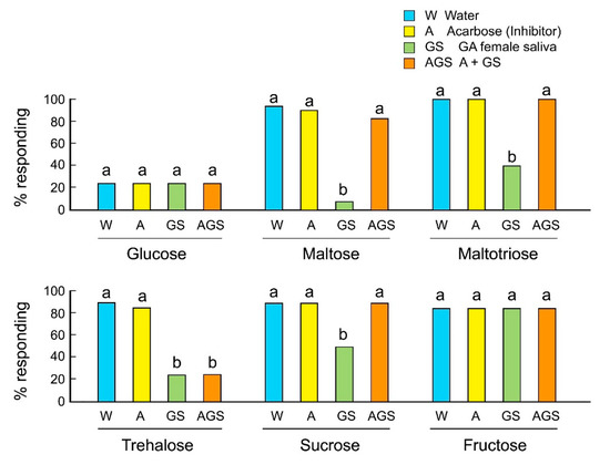 We evaluated the involvement of salivary alpha-glucosidases in the rejection responses of GA females to sugars using the alpha-glucosidase inhibitor acarbose. Acarbose inhibits maltases, glucoamylases, and sucrases, and prevents the hydrolysis of maltose, maltotriose, and sucrose to the monosaccharide glucose. Acarbose alone, mixed with sugar, did not influence the acceptance of sugars by GA females (Figure 3). As expected, saliva mixed with oligosaccharides decreased their acceptance. However, acarbose mixed with saliva rescued the acceptance of maltose, maltotriose, and sucrose, but not trehalose. The results indicate that saliva contains several types of sugar-degrading enzymes, including alpha-glucosidases and trehalases, and that these enzymes catalyze the release of glucose, which is perceived as a deterrent and induces rejection behavior in GA females.