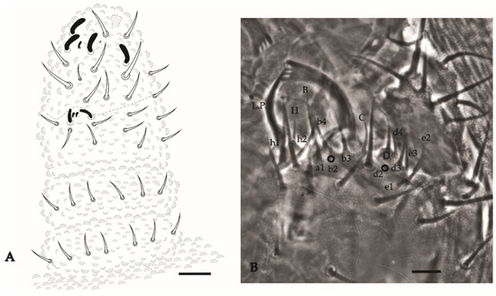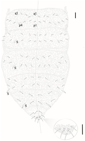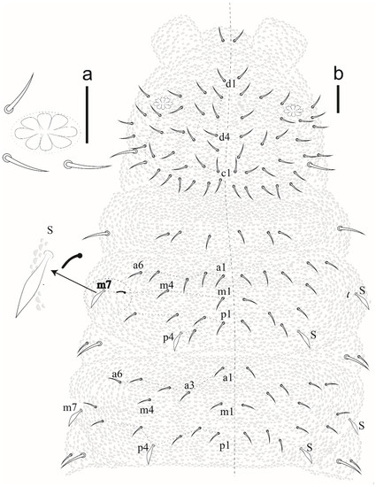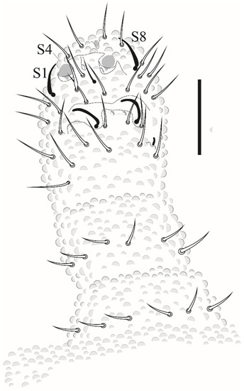 - Mendonça, C.; Arlé, R. Variação quetotáxica em Brachystomella agrosa Wray, 1953 (Collembola, Neanuridae). Bol. Mus. Nac. 1992, 351, 1–9. [Google Scholar]