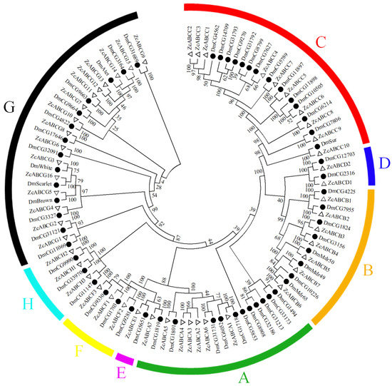 Phylogenetic analysis of ABC transporters in Zeugodacus cucurbitae. The phylogenetic tree was constructed by ClustalW alignment using the nucleotide binding domains (NBDs) of ABC transporters from Z. cucurbitae and Drosophila melanogaster. The number at the branch point of the bootstrap level was from 1000 replications with MEGA 7.0 using the maximum-likelihood method. The hollow diamond and solid circle represent different ABC proteins from Z. cucurbitae and D. melanogaster, respectively. Capital letters A–H with different colors indicate the different subfamilies of ABC transporters.