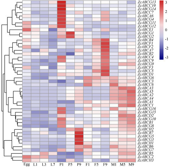 Expression profiles of ABC transporters at different development stages of Zeugodacus cucurbitae. Letters on the right are the gene names. The mRNA levels, represented by normalized log2 (FPKM + 1) values, are shown in the gradient heat map with colors ranging from blue (low expression) to red (high expression). L1, 1-day-old larva, L3, 3-day-old larva, L7, 7-day-old larva. In the same way, P represents pupa, F represents female adult and M represents male adult, the number represents the day.