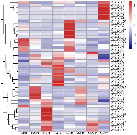 Expression profiles of ABC transporter genes in different tissues of Zeugodacus cucurbitae. The relative expression of each gene was normalized using log2 (FPKM + 1), and shown in the gradient heat map with colors. FB, fat body, MG, Malpighian tubule, MT, midgut, OV, ovary, and TE, testis. F represents female adult and M represents male adult.