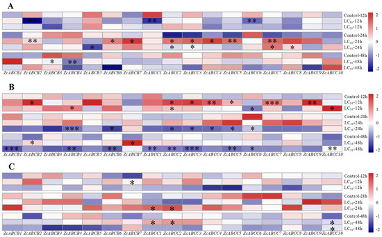The dosage of LC30 and LC50 insecticides were thereafter used to evaluate the induction of gene expression of ABC genes. The results showed that only ZcABCB7 and ZcABCC2, among 17 selected genes that are mainly involved in detoxification metabolism, were remarkably over-expressed in Z. cucurbitae when challenged by a LC30 of these three insecticides (Figure 4). For β-cypermethrin, ZcABCB1, ZcABCB6, ZcABCB7, ZcABCC2, ZcABCC3, ZcABCC4, ZcABCC5, and ZcABCC7 were significantly up-regulated 24 h after a LC30 dosage. ZcABCB2, ZcABCC1, and ZcABCC6 were significantly down-regulated by the LC30 dosage, and ZcABCB3 and ZcABCB4 significantly down-regulated after 48 h (Figure 4A). After exposure to abamectin, ZcABCB2, ZcABCB7, ZcABCC2, ZcABCC3, ZcABCC4, ZcABCC5, ZcABCC7, and ZcABCC9 were significantly up-regulated 12 h after dosage with the LC30. The mRNA expression levels were up-regulated from 1- to 2.5-fold. ZcABCB1, ZcABCB4, ZcABCB6, ZcABCC1, ZcABCC2, ZcABCC3, ZcABCC4, ZcABCC5, and ZcABCC6 were all significantly down-regulated 24 h and 48 h after a LC50 dosage (Figure 4B). After a challenge with dinotefuran, only the expression of ZcABCB7 was significantly up-regulated 12 h after a LC30 dosage. ZcABCC1, ZcABCC2, and ZcABCC10 were significantly up-regulated 48 h after a LC30 and 24 h after LC50 treatments (Figure 4C).