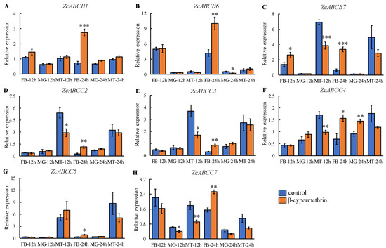 Expression of ZcABCB1 (A), ZcABCB6 (B), ZcABCB7 (C), ZcABCC2 (D), ZcABCC3 (E), ZcABCC4 (F), ZcABCC5 (G) and ZcABCC7 (H) in three tissues of Zeugodacus cucurbitae at 12 h and 24 h after exposure to a LC30 of β-cypermethrin. Student’s t-tests were performed for comparison with the corresponding control group, * p < 0.05, ** p < 0.01, *** p < 0.001.