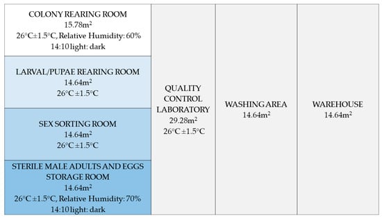 A mosquito colony was initiated from eggs collected in different municipalities of the Castellon and Valencia regions in 2014. The strain was maintained using standard procedures [24] until 2017, when the colony was expanded prior to the implementation of the pilot project. The mass-rearing facility was divided into seven areas as shown in Figure 1.