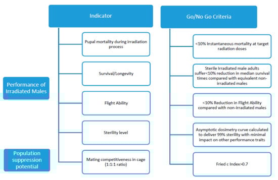 To evaluate the quality of the produced sterile males before release in the field, laboratory studies were carried out in line with the WHO-IAEA “Guidance Framework for Testing the Sterile Insect Technique as a Vector Control Tool against Aedes-Borne Diseases” [13] (Figure 3).