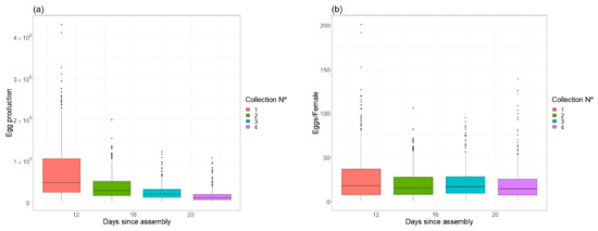 (a) Egg production in each egg collection. (b) Eggs per female over the time since cage assembly.