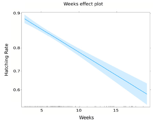 - Hatch rate. Results of egg hatching are shown in Table 5. According to the model, the egg hatching rate was declining with time in storage (Figure 7). After one week of collection, the expected hatching rate was 90.6% (Std. Error = 0.56%). After 5 weeks, it was reduced to 86.2% (Std. Error = 0.43%), and after 20 weeks, it dropped to 54.8% (Std. Error = 3.40%)