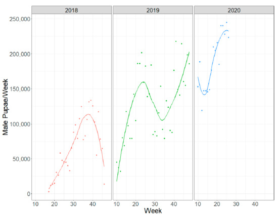 The total production of male pupae fluctuated, with an increasing trend over the course of the project (Figure 8). On the submission date, the production capacity was about 240,000 male pupae/week.