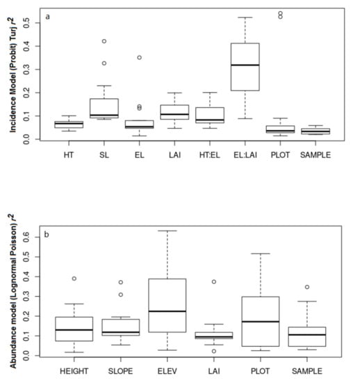 Box and whisker plots illustrating the proportion of variance in trap captures explained by environmental variables across species; (a) Incidence model (Probit); (b) Abundance model (Lognormal Poisson). Only species with a predictive r2 of >0.10, based on a 5-fold cross-validation, were included. Models were estimated using Hierarchical Modeling of Species Communities (HMSC; Ovaskainen et al. 2017 [39]).