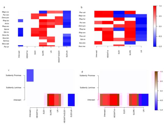 Heatmap illustrating the support (>0.80) for positive or negative β-coefficients across species (y-axis) and environmental factors (x-axis) (a,b) and for γ-coefficients across cerambycid subfamilies (c,d) (Cerambycinae was the baseline group and hence represents the intercept, while Prioninae was represented by a single species, Megopis costipennis); (a,c) Incidence model (Probit); (b,d) Abundance model (Lognormal Poisson). Red indicates a positive coefficient, while blue indicates a negative coefficient. Models were estimated using Hierarchical Modeling of Species Communities (HMSC; [39]). Only those species for which the predictive Tjur r2 or r2, respectively, based on a 5-fold cross-validation, was >0.10 have been included.