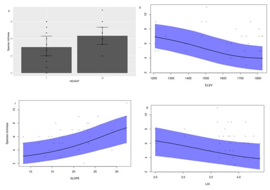 Community responses: Species richness vs. (a) Trap height; (b) elevation; (c) slope; (d) leaf area index.