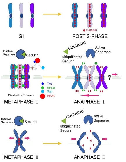 - Buonomo, S.B.; Clyne, R.K.; Fuchs, J.; Loidl, J.; Uhlmann, F.; Nasmyth, K. Disjunction of Homologous Chromosomes in Meiosis I Depends on Proteolytic Cleavage of the Meiotic Cohesin Rec8 by Separin. Cell 2000, 103, 387–398. [Google Scholar] [CrossRef]