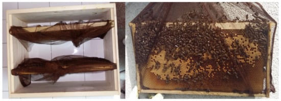 Frames with a sealed brood prior to emergence were taken from the five chosen colonies, placed in net bags (to prevent the dissipation of emerged bees) and kept overnight in an incubator (Figure 1) with a constant temperature (34 ± 1 °C) and humidity (66 ± 1%). The following morning, newly emerged worker bees were randomly collected from different frames and allocated to cages. Eighty bees were placed in each cage (specially designed by Glavinic et al. [] for this purpose). Two series of the whole experiment were performed and the merged data were processed.