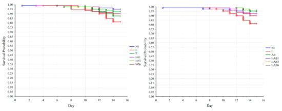 A significant difference in bee survival (p = 0.006) was affirmed when comparing groups treated with A. blazei extract and control groups using χ2 statistics. The log-rank test revealed that mortality was higher in group I (Figure 2) than in the NI (p = 0.008), AB (p = 0.003), and I-AB1 and I-AB3 (p = 0.037) groups.