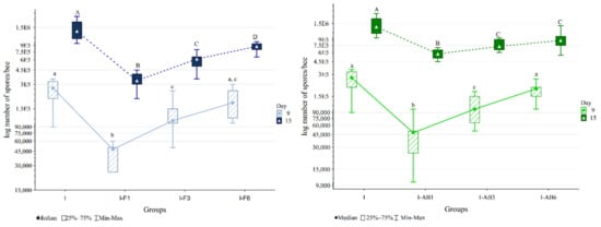 The absence of Nosema spores in non-infected bee groups (NI, F and AB) confirms that the cage-type experiment used in this study prevents cross-contamination during the research []. The presence of Nosema spores in all infected groups proved that the inoculum with the final concentration of 1 × 106 spores/ml succeeded in causing the infection, similar to some previous experiments [,,,].