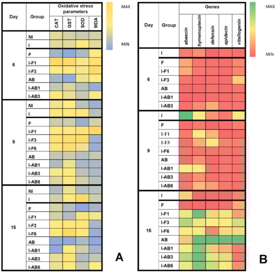 Heatmaps: (A) mean values for superoxide dismutase (SOD), catalase (CAT) and glutathione S-transferase (GST) activities and malondialdehyde (MDA) concentration; (B) immune-related genes (medians of Log2 of relative expression ratios for abaecin, hymenoptaecin, defensin, apidaecin and vitellogenin) at different time points in experimental groups. Non-infected control (NI), N. ceranae infected control (I) and groups infected and treated with fumagillin from day 1 (I-F1), day 3 (I-F3) and day 6 (I-F6) or A. blazei extract from day 1 (I-AB1), day 3 (I-AB3) and day 6 (I-AB6). Group names are indicated in Table 1.