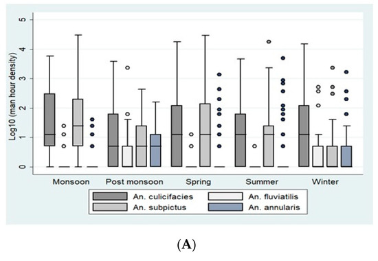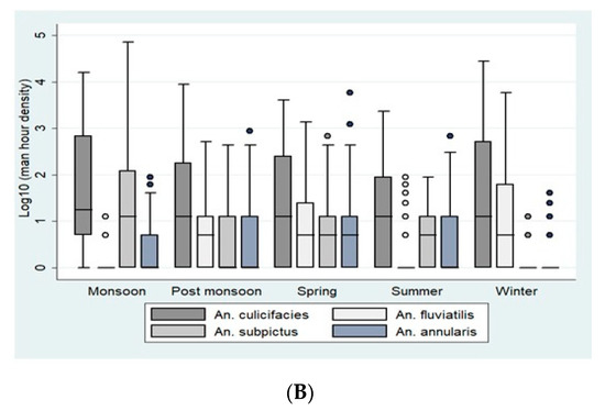 (A). Season-wise average per man-hour density (indoor resting collections) in Bastar. (B). Season-wise average per man-hour density (indoor resting collections) in Korea district. The boxes in the plots correspond to the log-transformed values of man-hour densities of An. culicifacies, An. fluviatilis, An. subpictus, and An. annularis across different seasons. The densities are represented in the boxes as Quartile 1, median, and Quartile 3. The whiskers represent the highest and the lowest densities.