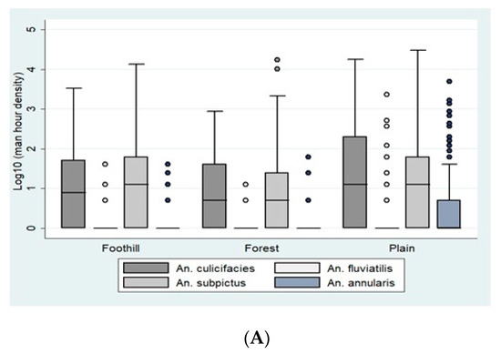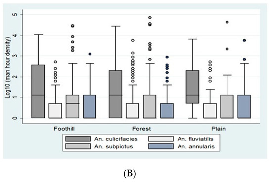 (A). Ecotype-wise per man-hour density (Indoor Resting Collection) in district Bastar. (B). Ecotype-wise per man-hour density (Indoor Resting Collection) in district Korea. The boxes in the plots correspond to the log-transformed values of man-hour densities of An. Culicifacies, An. Fluviatilis, An. Subpictus, and An. annularis across different ecotypes, including foothill, forest, and plain. The densities are represented in the boxes as Quartile 1, median, and Quartile 3. The whiskers represent the highest and the lowest densities