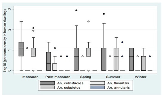 Seasonal pyrethrum spray catches in human dwellings in districts Bastar and Korea. The boxes in the plots correspond to the log-transformed values of per room density in human dwellings across different seasons. The densities are represented as Quartile 1, median, and Quartile 3. The whiskers represent the highest and the lowest densities.