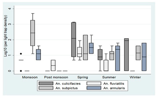 Ecotype and season-wise Anopheles mosquito diagnosed for malaria parasites (Plasmodium falciparum and P. vivax) by polymerase chain reaction (PCR) method.