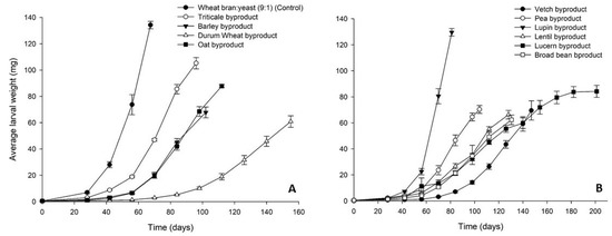 The increase of T. molitor average larval weight on the different byproducts over time is graphically presented in Figure 1. Regarding the cereal byproducts (Figure 1A), triticale byproduct gave the best results close to the control (134 ± 3 mg), reaching a final average larval weight of 108 ± 6 mg, whereas the final average larval weight for the rest of the cereal byproducts ranged between 64 ± 9 (durum wheat byproduct) and 90 ± 5 mg (oat byproduct). Among the legume byproducts, lupin performed at best with a final average weight of T. molitor larvae of 130 ± 3 mg (Figure 1B). Lower final larval weights were recorded for the rest of the legume byproducts ranging between 63 ± 4 (broad bean byproduct) and 80 ± 5 (lucerne byproduct).
