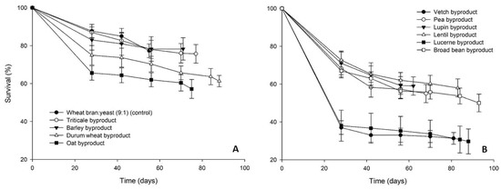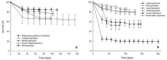 Survival rate (%) of Tenebrio molitor larvae reared on byproducts of the seed cleaning process of cereals (A) and legumes (B) or a mixture of wheat bran and yeast (9:1) (control). In all cases, values represent means ± SEM (n = 6).