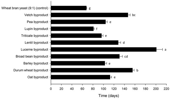Development time (days) of Tenebrio molitor larvae reared on byproducts of the seed cleaning process of cereals and legumes or a mixture of wheat bran and yeast (9:1) (control). Bars followed by the same lowercase letter are not significantly different. In all cases, values represent means ± SEM (n = 6; df = 10; p = 0.05).
