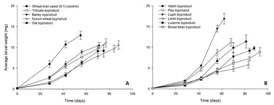 In the case of A. diaperinus, all cereal byproducts tested were suitable for rearing of its larvae, resulting in high final average larval weight (>10 mg). Data on the growth of A. diaperinus on cereal-based diets is rather limited. When fed with different cereal flours, i.e., wheat, barley, corn and rice flour, A. diaperinus growth was reduced compared to a mixture of whole meal flour:yeast used as control [38]. Moreover, differences were observed among the development rates on the various cereal flours tested [38]. Similar to T. molitor, among the legume byproducts tested the lupin byproduct was the best, in terms of larval growth and final weight at the end of the bioassay, indicating the potential of lupin byproducts for integration in the diets of A. diaperinus diets. In contrast, in lucerne high larval mortality rates were recorded for both A. diaperinus and T. molitor (20–30% final survival) and this effect may be attributed to specific components of this plant, such as saponins, which are known to have antinutritional properties [39,40]. Specifically for insects, it is suggested that saponins have also insecticidal activity, as the increase of lucerne saponin rates into an artificial diet of the European grape moth, Lobesia botrana Den and Schiff (Lepidoptera: Tortricidae), resulted in increased larval mortality [41]. Therefore, it could be suggested that the use of lucerne-related substrates should be avoided or extensively tested prior to inclusion in diets of T. molitor and A. diaperinus. This may be the case also for the vetch byproduct, in which low larval survival (31%) for A. diaperinus and reduced survival (55%) for T. molitor were recorded, as common vetch seeds also contain antinutritional factors which need to be removed or inactivated prior to utilization as feedstock [42].