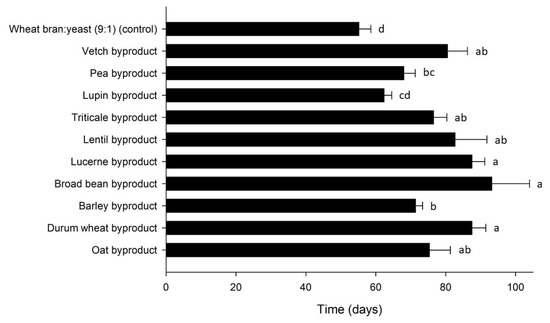 The larval development time for A. diaperinus was influenced by strain (Mantel–Cox χ2 = 66.4, df = 10, p < 0.001) and varied between 55 and 93 d over treatments (Figure 6). Larvae grew faster on the control diet (55 ± 3 d) and on the lupin byproduct (62 ± 2 d). Significant differences were observed among the FCR values calculated for the tested byproducts (Table 3). The lowest FCR values, corresponding to the highest feed conversion efficiencies, were recorded for the control diet (2.3), as well as the lupin (2.7), barley (4.8) and triticale byproduct (5.1). Similarly, the higher growth rates were obtained for the control diet (7.8% d−1) and for the lupin byproduct (7.3% d−1). There was a positive correlation between development time and FCR (r = 0.396, p = 0.001), and a negative correlation with SGR (r = −0.849, p = 0.001). The lowest ECR values were calculated for barley (667 € ton−1 larvae), triticale (719 € ton−1 larvae) and oat byproduct (755 € ton−1 larvae). As expected, lower ECR values, which correspond to a higher economic performance, correlated with lower FCR values (r = 0.730, p = 0.001), which are indicative of a higher feed conversion efficiency.
