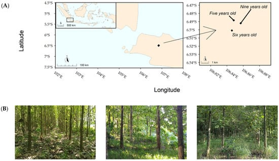 (A) Plantation locations in Cibinong, West Java, Indonesia; (B) plantation landscapes, from left to right: five-year-old, six-year-old, and nine-year-old plantations.
