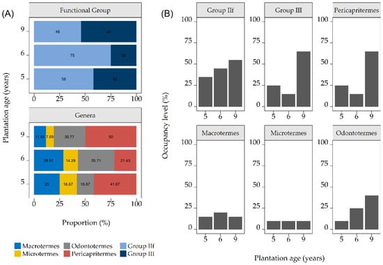 Termite assemblage based on (A) proportion and (B) occupancy in three teakwood plantations. The denominators used to calculate the proportions were the total numbers of genera and functional groups observed during the study; for occupancy, it was the total number of plot sections per plantation (20 sections).