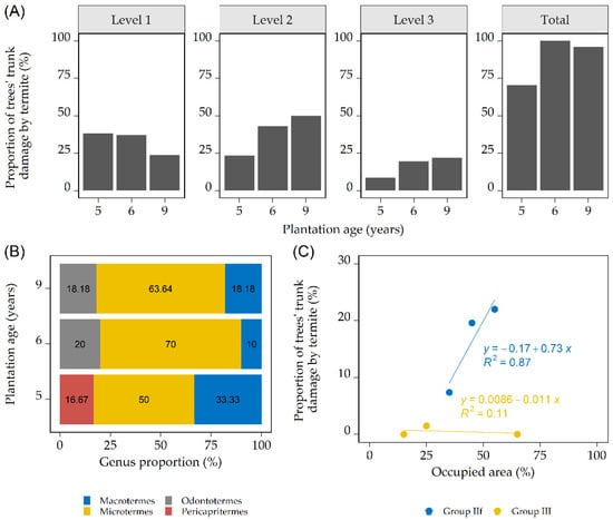 The data in Figure 3A show that there was a decrease in Level 1 damage and increases in Levels 2 and 3 along the plantation age. The data also show that the total number of trunks damaged by termites was higher in the six- and nine-year-old plantations than in the five-year-old plantation, which is interesting since the five- and six-year-old plantations are closer in age to each other than they are to the nine-year-old plantation. The most common termites that caused damage on trunks were from group IIf, with Microtermes as the biggest contributor (Figure 3B). The relationship between the occupied area and termite attacks (Figure 3C) indicated that group IIf termites attacked trees and were positively correlated with the increase in the occupancy area; it should be noted that this is based on a small amount of data.