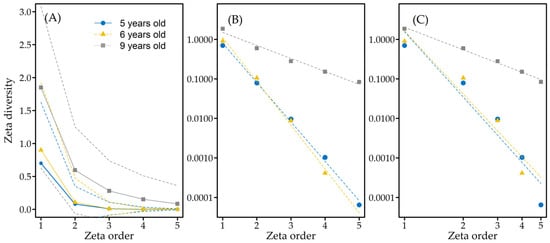 To further verify the zeta diversity, the species accumulation curve for each plantation was also constructed using EstimateS (Version 9.1, R. K. Colwell, http://purl.oclc.org/estimates) (accessed on 1 April 2019) with 100 randomizations with replacements for curve smoothing. We present the curves in the supporting materials (Figure S1).