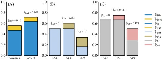 Beta diversity partitioning at (A) the multisite level using the Sørensen index with turnover (βSIM) and nestedness (βSNE) and the Jaccard index with turnover (βJTU) and nestedness (βJNE); (B) Sørensen pairwise level with turnover (βsim) and nestedness (βsne); (C) Jaccard pairwise level with turnover (βjtu) and nestedness (βjne). The values of βRAT and βrat were calculated as the ratio of nestedness to the total nestedness plus turnover. The pairwise comparison label format, e.g., 5&6 = five-year-old plantation compared to six-year-old plantation.
